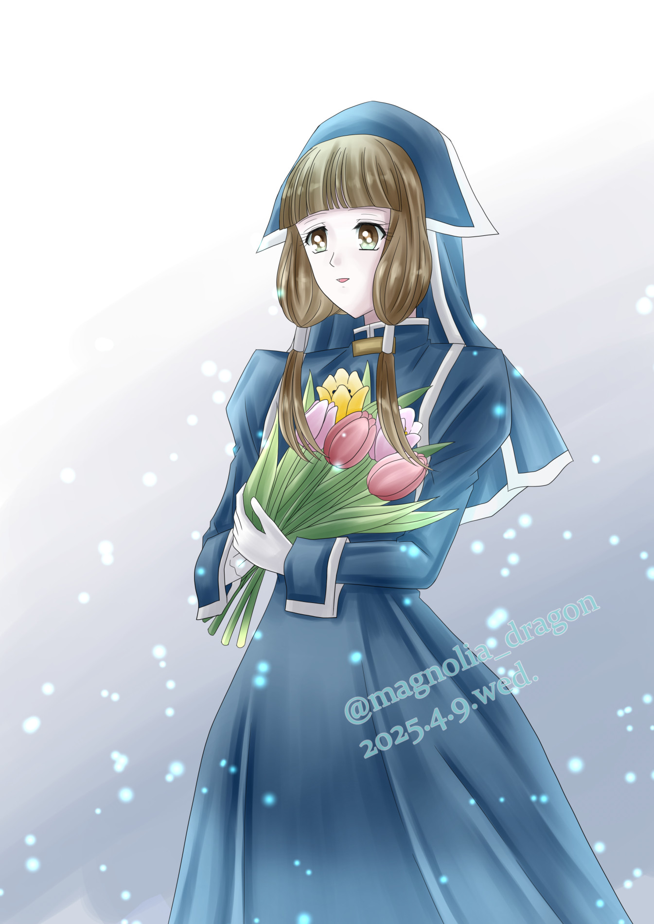 アムステルダムで彼女の育てる花ってチューリップも含まれてたよなぁと思い、今回デジタルでは初めて花を手描きしたのですが描きなれてない感はともかく、アグネスさんの全体的な色(髪・衣装など)がシックな分、パステルに近い色味でコントラストがきいてるといいかなぁと。