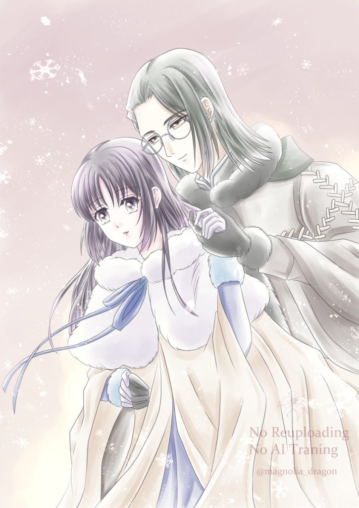 初心に戻るつもりで描いたさんちづ。本編とED後冬外套スタイルがすごく好き過ぎる故に、月影衣装って私としては珍しいですね。私の趣味も混じって髪は解かせてますが、あの月影EDもなんだかんだ言いつつも好きです。ただ愛を確かめ合うだけでなく、やはり本編の「君を置いて先に死んだりしない」は前提でもあるかもしれないという切なさと、それでも一縷の望みに懸けるという希望の表裏が入り混じってる感が好きです。シチュレーション的にも美ですね!