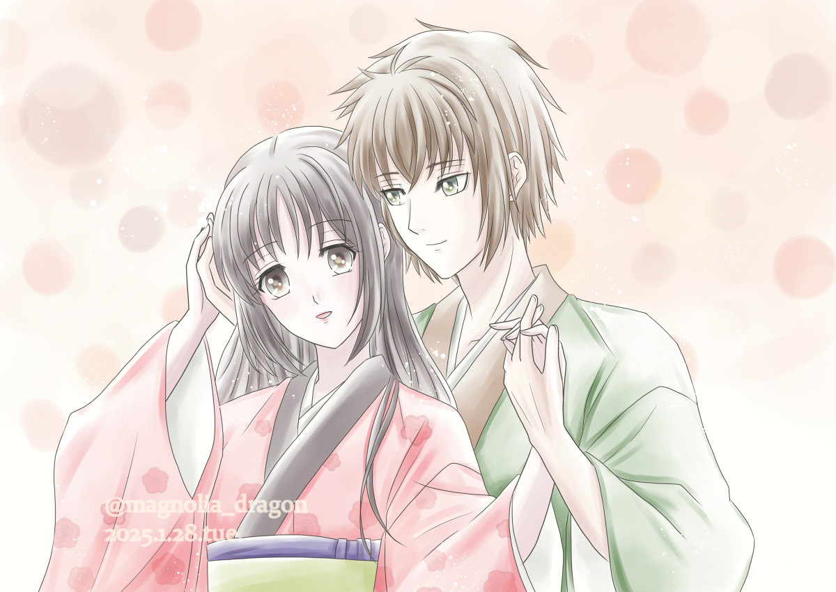 へいちづちゃんでCPらしいのを!!!が描きたい面目もあり、髪下ろし千鶴ちゃんと平助君。今回こだわりとして、あえて少し崩しがちに左手同士を絡ませる&ふたりらしい淡い恋心みたいなのが欲しくて、背景は立春近くの配色を参考にしました…紅梅のような温かめのピンクが似合うのがへいちづだと信じて疑わない!
