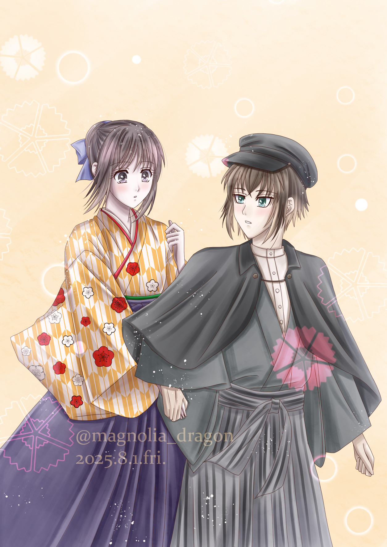 お互いを異性と意識し合う的な、大正ロマンパロへいちづちゃん。まだまだコラボ月間の最中ですが、今月は平助君月間だったな~と思い出しつつ、どうしても今月に描きたかったので…!相変わらず千鶴ちゃんのお召し物は捏造…いいんだ、推しにはコラボのとはまた違うのとかも着飾らせてやりたいんだよ!平助君のバンカラスタイルは精一杯のおしゃれ…うん、魁先生らしいといえばらしいですね。