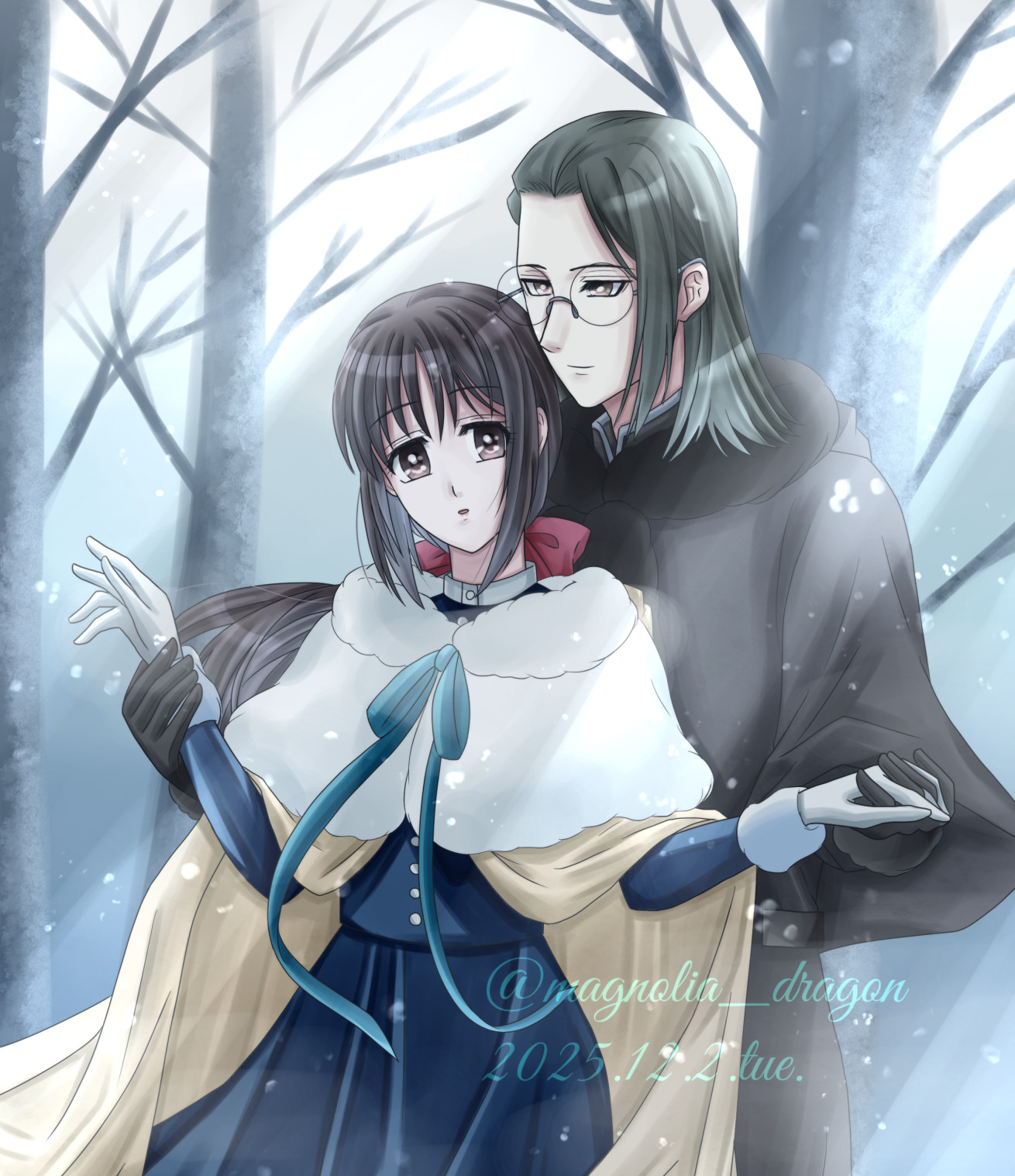 冬の景色らしきもの描きたくなった&バックからの手の表現増やしたい&配色本の色味素敵~の三拍子のビッグウェーブが来たので一枚絵描きたくなって描きました。